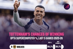 OPTA也对此进行了分析预测,他们统计显示热刺最后5轮的赛程难度相对轻松,在各队赛程难度位列第15位。但想要打出5连胜的几率仍然微乎其微。