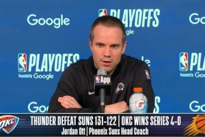 24直播网4月28日讯 今日NBA季后赛首轮,太阳122-131不敌雷霆,0-4遭淘汰。赛后,太阳主帅奥特接受了媒体采访,以下为完整版采访内容。