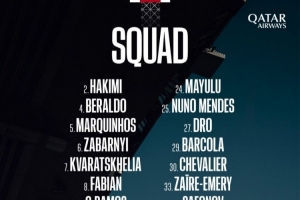 后卫:2-阿什拉夫、4-贝拉尔多、5-马尔基尼奥斯、6-扎巴尔尼、21-卢卡斯、25-努诺·门德斯、51-帕乔