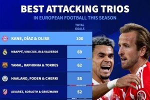 24直播网4月29日讯 拜仁在本轮欧冠客场4-5不敌巴黎,三叉戟各进一球。数据统计显示,拜仁三叉戟本赛季各项赛事总进球数是五大联赛各队三人组最多。
