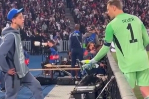 而在巴黎的一次反击出了底线之后,拜仁门将诺伊尔向身后的球童索要足球,但对方踩着足球不予理会,诺伊尔也只能无奈转身寻找其他足球。
